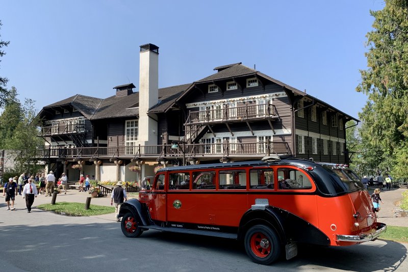 Met de Red Bus over Going-to-the-Sun Rd, hier bij Lake McDonald Lodge
