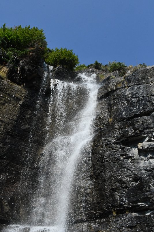 Met de Red Bus over Going-to-the-Sun Rd, hier bij een van de vele watervallen vlakbij Siyeh Bend