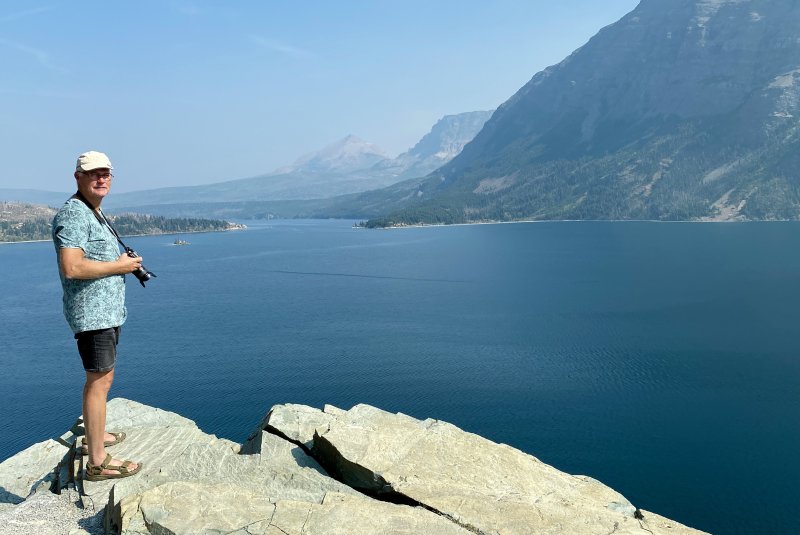 Met de Red Bus over Going-to-the-Sun Rd, hier bij Saint Mary Lake