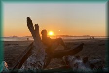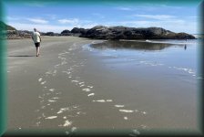 Op onze weg terug maken we een stop bij South Beach en lopen daar nog even heerlijk over het strand. Opvallend hoeveel hout hier aanspoelt. Hetzelfde doen we later in de middag nog op het strand bij onze camping. Met alweer 17,5 km in de benen, ik had me voorgenomen niet meer zo ver te lopen, werd het tijd voor een glaasje, heerlijk in het zonnetje. Vanavond nog even naar het strand gelopen voor de zonsondergang. Aks de zon nog maar net onder is zie je de mist vanuit zee al weer opkomen.