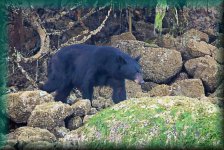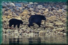 Een vroege start vanochtend. Om vijf uur gaat de wekker. Het is nog donker als we naar Tofino rijden voor onze bearwatching tour. Nadat we ons in de pakken hebben gehesen vertrekken we met nog 10 andere mensen in een zodiac het water op om bij eb langs de oevers mogelijk beren te spotten. Helaas hebben we weer te maken met dichte zeemist waardoor we weinig van de omgeving zien maar elk nadeel heb zijn voordeel ze varen hierdoor ook dichter aan de kant als normaal. Het duurt even maar dan zien we een zwarte beer met twee jonkies scharrelen tussen de stenen. De stenen worden gekanteld om de krabbetjes en kleine visjes er onderuit te halen. Je hoort dat goed. Een half uurtje later zien we nog een zwarte beer met een jonkie, nu nog dichterbij. Zo geweldig gaaf om te zien. Als we terug varen krijgen we geleidelijk aan ook meer een beeld van de omgeving als de mist langzaam oplost. Ook een zeehond laat nog even z’n snoet boven water zien. Al met al was het het vroege opstaan zeker waard.