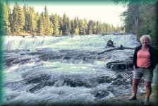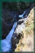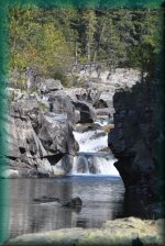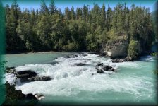 Verder rijdend maken we een stop bij Rearguard Falls. Na een korte wandeling komen we bij het watergeweld waar in de late zomer / begin herfst de zwemmende Chinook zalmen te zien zijn die terugkeren naar hun geboorte rivier. Ook nu zien we er af en toe al eentje opspringen en lukt het warempel ook om dat vast te leggen op de plaat.