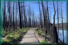 We steken de Athabasca River over en maken een rond wandeling bij Annette en Edith Lake. De laatste is ontsnapt aan de brand maar Annette Lake niet. Zo jammer. Bij terugkomst een brief op de voorruit. We hadden hier dus niet in gemogen met de camper. Of we hier rekening mee willen houden, verder niets.