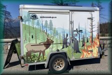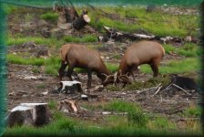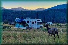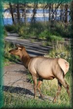 In de avond gaan we een wildlife tour doen die we geboekt hadden. Kon eigenlijk onze ochtend niet overtreffen en dat was ook zo. Veel informatie over het wildlife dat wel maar het was meer een sightseeing tour dan een wildlife tour. Indrukwekkend was het verhaal o.a. dat na de brand vorig jaar de grizzlyberen massaal de stad in kwamen en in de verbrande hopen op zoek gingen naar eten o.a in niet niet helemaal verbrande diepvrieskasten. De oogst van het wildlife vanavond beperkte zich tot elks en een bever. Toen we terug over de camping liepen zagen en hoorden we twee mannetjes elks met elkaar vechten. Het is bronstijd nu. Dus het wildlife weer dichterbij dan gedacht. Het was weer een heerlijk dagje. Extreem warm voor de tijd van het jaar hier.