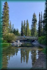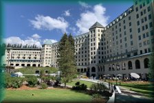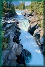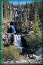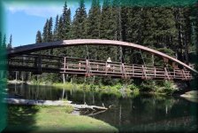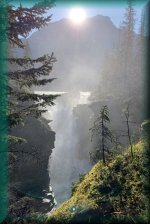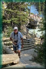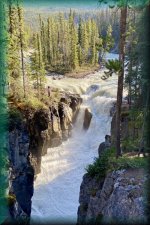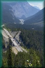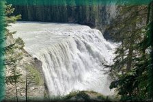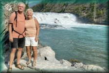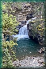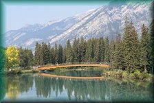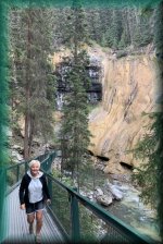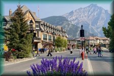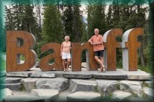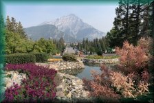 Banff is een mooi verzorgde stad in een indrukwekkende alpiene omgeving. Het is het hele jaar door een erg populaire toeristische bestemming maar wij vonden het nu vrij rustig. In de ochtend schijnt er nog een lekker zonnetje, later ook maar de smog van de rook geeft weer een aardige sluier. In Banff lopen we eerst door de met bloemen en vlaggen versierde hoofdstraat Banff Avenue richting de Cascades of Time Garden. Van hier uit lopen we de Art in Nature trail (leuk om te doen) richting de Bow Falls.