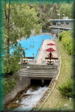 In Radium Hotsprings gaan we natuurlijk even naar het zwembad met natuurlijk water uit de hete bronnen, gekoeld tot temperaturen tussen de 37 en 40 graden. Echt even lekker!