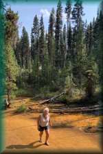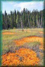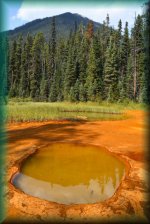 Bij de Paint Pots lopen we een korte trail naar een bijzonder geologisch verschijnsel, roestkleurige mineraalbronnen met okerkleurige oevers. Ze voorzagen de First Nations van okerkleurige verf.