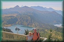 Boven aangekomen gaan we ook hier verder met de stoeltjeslift naar een uitzichtpunt waar we een prachtig uitzicht hebben op drie alpine meren. Rock Isle, Laryx en Grizzly Lake. Jammer dat het een beetje heiig is, door wat we later horen, een brand in de buurt van Calgary. Dat ligt uiteindelijk maar zo’n 100km hier vandaan. Je kon het soms ook wel ruiken. We wandelen boven een tijdje rond en genieten van het 360 graden uitzicht.