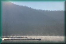 Na het ontbijt verlaten we dit paradijsje en rijden we naar Cameron Lake. Tussen de bergen nog volop mist maar bij het meer deed de zon zijn werk en zagen we de nevel over het meer wegtrekken. Wel een mooi gezicht. Klein stukje gewandeld en op de terugweg een korte stop bij de First Oil Well. Hier werd eind 19e eeuw olie gewonnen maar bedrijven zijn nooit succesvol geweest.
