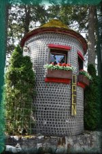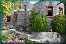 Eerst weer boodschappen, vooral vers natuurlijk ! We rijden de route verder oostelijk van Kootenay Lake. Een meer van 90 km lang. We maken een korte stop bij het Glazen Huis. Een object met een bijzonder verhaal. Mr Brown was jarenlang begrafenisondernemer en pakte het idee op om van de lege vierkante flessen van de balsem vloeistof een huis te bouwen. (1952) Hij verzamelde door het land heen meer als een half miljoen van die flessen. De inrichting van het huis is ook nog van de jaren 60 -70. Familie van de inmiddels in 1970 overleden man zijn aanwezig om bezoekers te ontvangen en hen toegang te verlenen tot een onvergetelijk stuk bouwkunst.