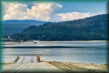 Vandaag gaan we een flinke stap zetten weer richting Vancouver. We gaan het traject van Nelson naar Kelowna overbruggen maar wel via een mooi en afwisselend landschap. Starten we nog met de rockies en de vele meren, inclusief een korte overtocht met een ferry, we eindigen met een landschap van boomgaarden, weides en heuvels. Het weer is al net zo afwisselend, zon,wolken en zelfs een onweersbui. Prima reisdag dus al met al.