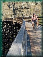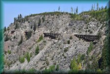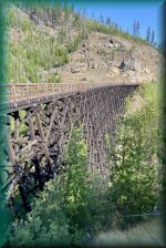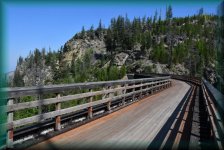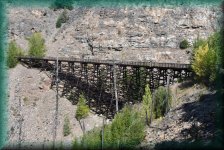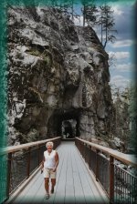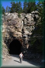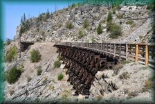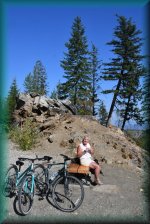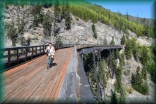 Na het ontbijt gaan we met de camper 8 km omhoog over een dirty road zoals ze dat hier noemen. We doen er een klein half uur over maar het gaat prima. Boven aangekomen staan onze gereserveerde fietsen al klaar voor onze tocht over de Kettle Valley Railway. Deze oude spoorweg loopt door de spectaculaire Myra Canyon over een traject met voormalige spoorbruggen en door oude tunnels. In het totaal is de route 24 km lang, 12 heen en ook weer terug en loopt tussen de voormalige stations Myra station en Ruth station.
