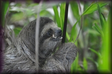 ManzanilloManzanillo is een klein rustig stranddorpje.We drinken daar wat maar besluiten halverwege de terugweg ergens wat te eten. We vinden  ook een aardig tentje langs de weg en richting Puerto Viejo worden we opnieuw verrast met een luiaard. Deze toont zich in vol ornaat prachtig hangend aan een lage tak. Geweldig!