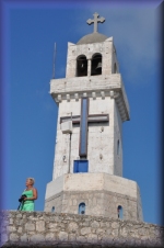In het hoogst gelegen dorp (520 meter) van Ithaki, Anogi gaan we op zoek naar de enorme monolieten. Er zit een oude man op een bankje en we vragen aan hem waar we deze kunnen vinden door een plaatje in een folder aan te wijzen. In zijn beperkte Engels maakt hij ons duidelijk dat er in dit plaatsje alleen een klokkentoren en een kerkje is en met een brede glimlach, een hand en een kusje laat hij mij weten dat die monolieten toch echt daar niet zijn. We vinden ze dan ook niet.